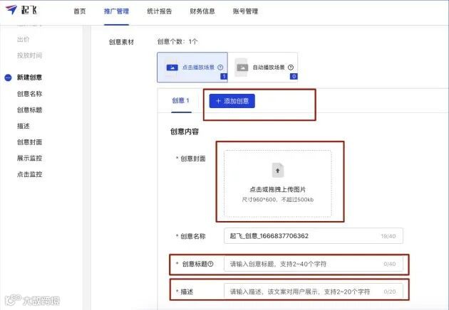 创意页面的设置将直接影响转化率,即点击率高低主要取决于你的创意设置,好的素材封面和标题+描述是吸引用户点击最直接的因素。