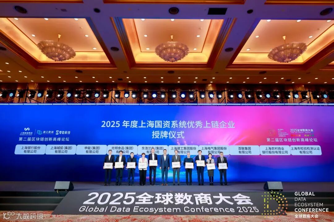 在2025全球数商大会第二届区块链创新高峰论坛上还举行了2025年度上海国资系统优秀上链企业授牌仪式,上海银行、上海城投集团、申能集团、光明食品集团、东浩兰生集团、上海建工、上海电气、百联集团、上海农商银行、上检公司获得授牌。