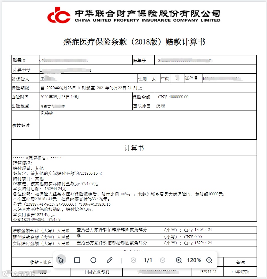 客户投保后3个月左右乳腺不适到医院进行治疗,确诊乳腺癌后,医疗费用共计花费238187.41元,医保报销96337.26元,减去免赔额后,剩余部分保险来帮忙,获赔13.29万元。