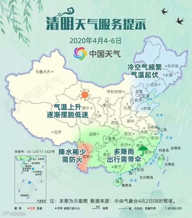 而北方大部以晴到多云的天气为主,降水稀少,不过4月3-4日,受冷空气南下影响,东北、华北等地将出现4-6℃,局地8℃以上的降温,部分地区伴有4-6级风。