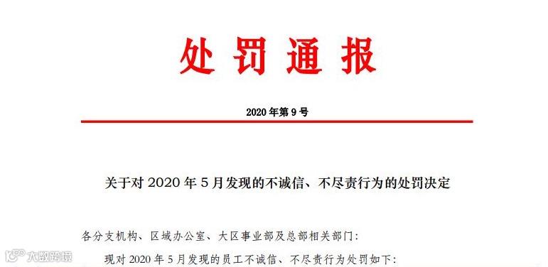 6月28日,我司法务监察部发布一则处罚通报-2020年第9号《关于对2020年5月发现的不诚信、不尽责行为的处罚决定》。其中就讲到有员工利用职务之便,侵占、滞挪保费的不法行为,我司进行了相关的处罚及通报。