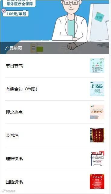 推送出产品单图、节日节气、有趣金句、热点理念、荣誉墙、理赔快讯及团险资讯七大板块的素材链接,且素材一直都在上新和完善中。