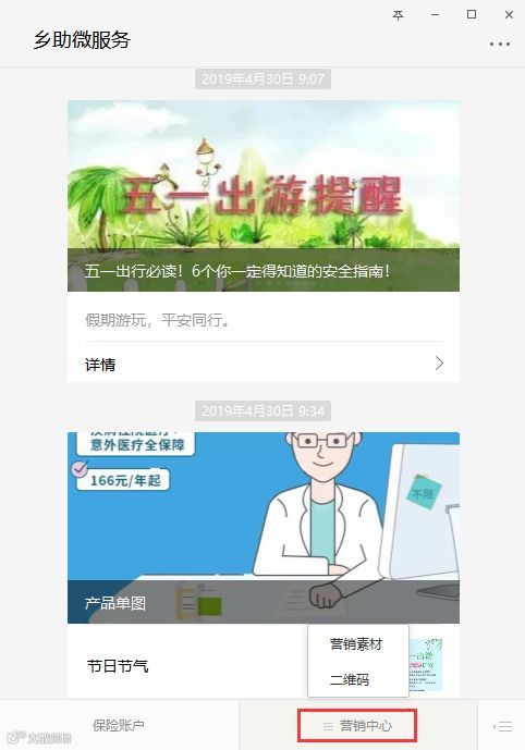 ▎公众号页面有两大菜单栏:“保险账户”和“营销中心”