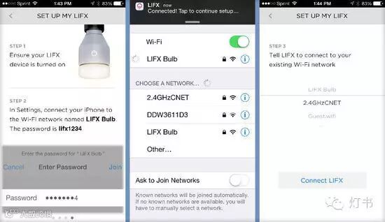 一旦你打开这个应用程序,它将指引你进行配对过程,这很简单明了。当你第一次打开Lifx灯泡时,它会传出一个WIFI信号,你只需像加入其他网络一样添加这个信号,然后返回Lifx应用程序,跳回你的家庭网络,仅此而已。