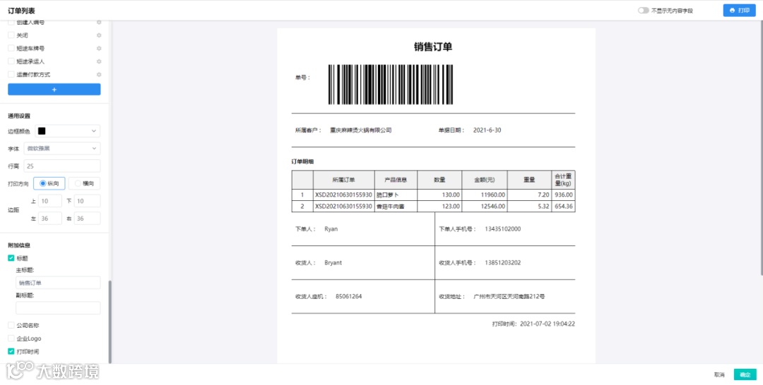 对接数据后使用白码上的打印功能可以根据我要打印的内容进行自定义设置模板,我需要打印什么内容直接勾选就行了。模板保存之后下次还能继续用,不想用这个模板了还能再创建一个新的,这就很灵活了。还能将单号等转换成条形码或者是二维码,打印出来后扫码就能看到这个订单中的信息。