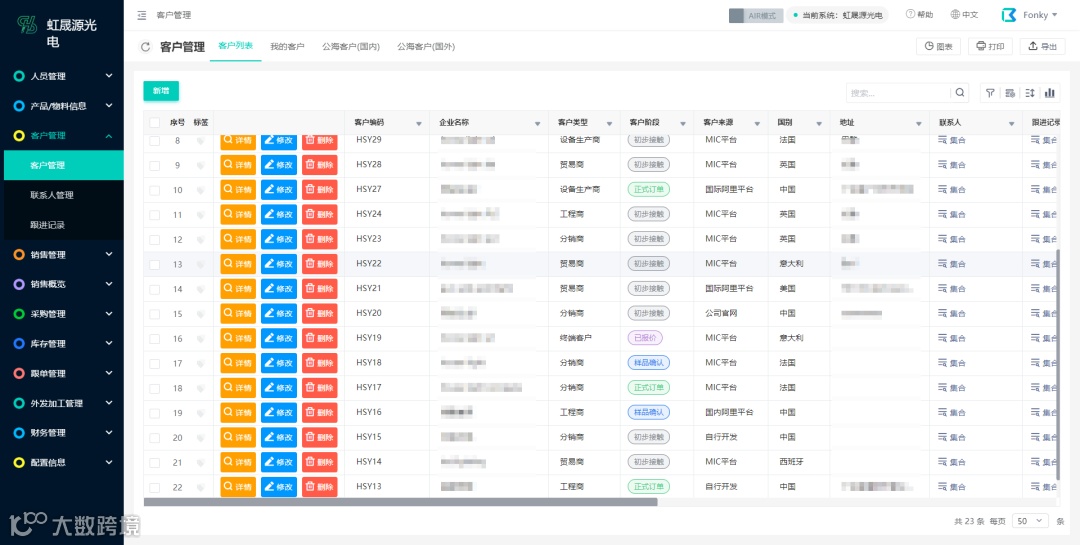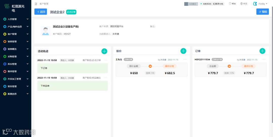 虹晟源光电进销存系统记录了企业客户的详细信息,包括客户类型、客户来源、客户阶段等。从企业初步接触客户到订单成交,每个环节都能实时查看客户阶段。另外还有客户详情页,详细记录了各个客户的活动轨迹、报价记录、订单记录;便于管理层分析各个客户阶段占客户总数的比例,从而更好的进行销售策略的决策,促进销售人员成单。