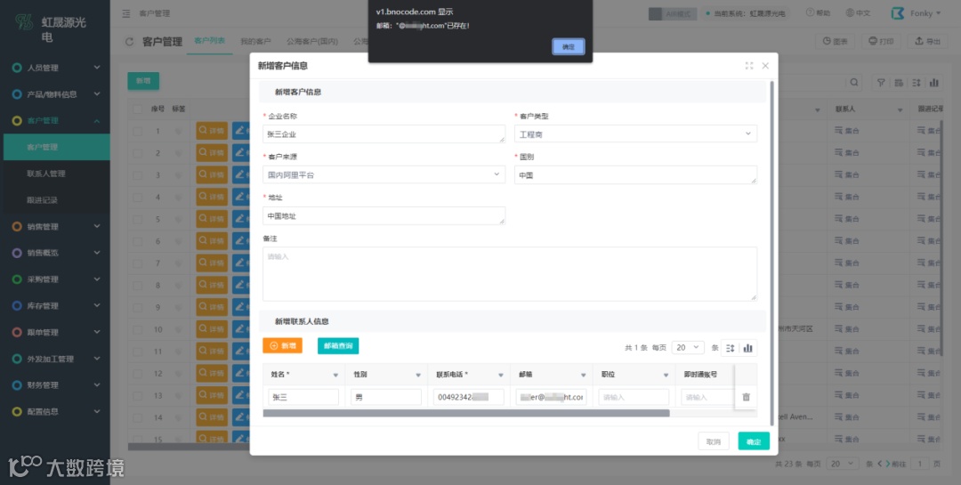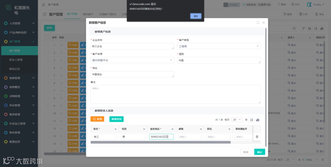 通过白码低代码平台开发的虹晟源光电进销系统,对客户名称、电话、邮箱来判断并且进行去重措施,有效的避免了客服撞单问题的产生。