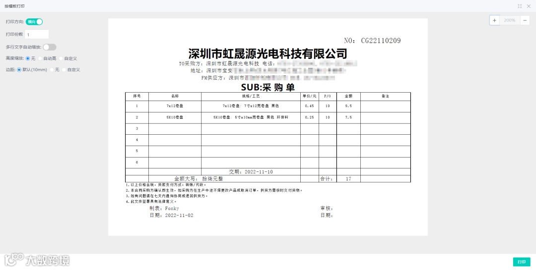 白码进销存系统实现了全程数字化操作,可自定义打印采购单、生产单、外发加工单模板,告别手写信息,能够更快的流转到下一个流程。