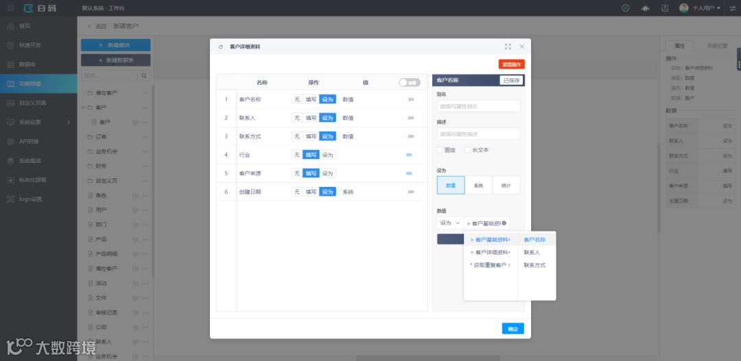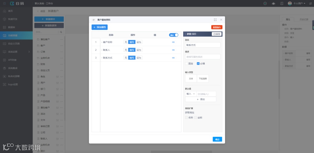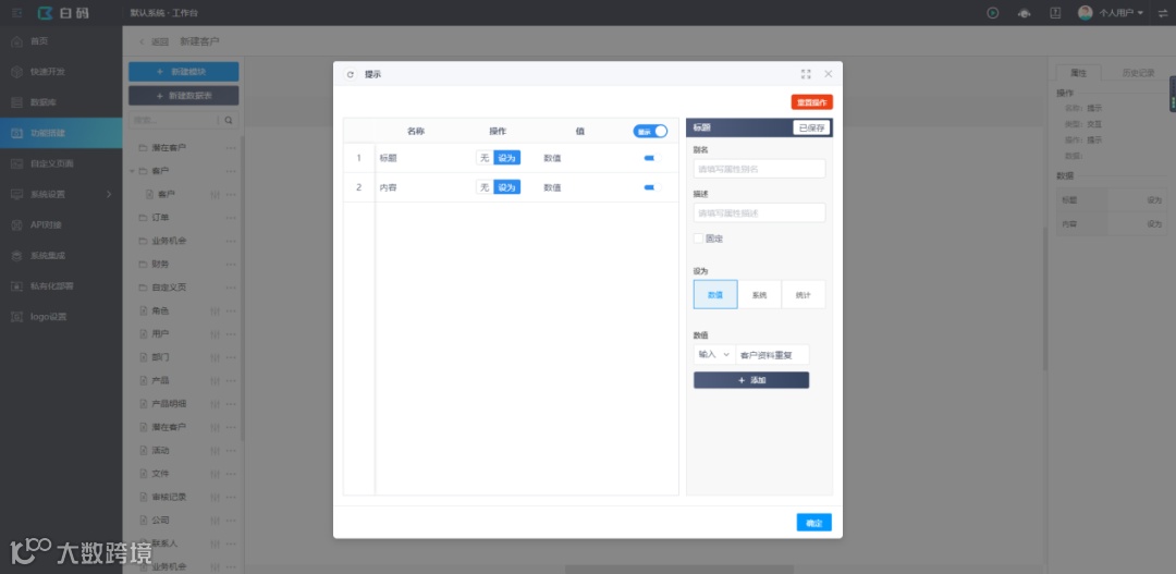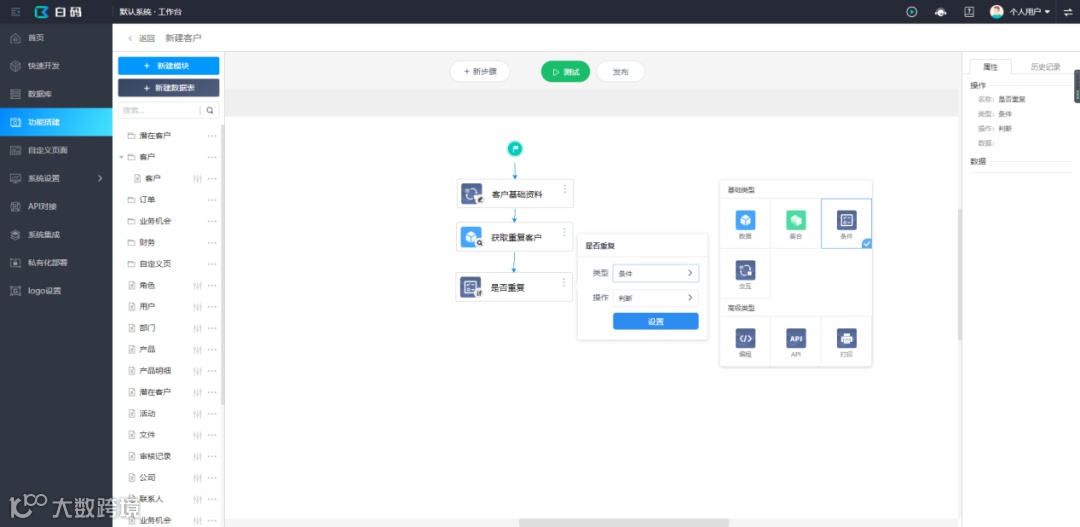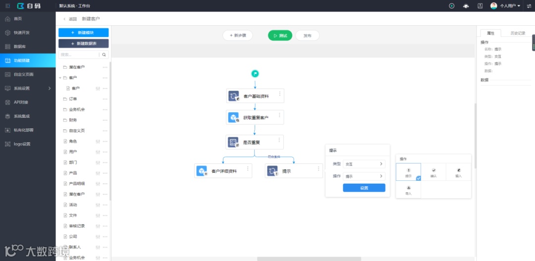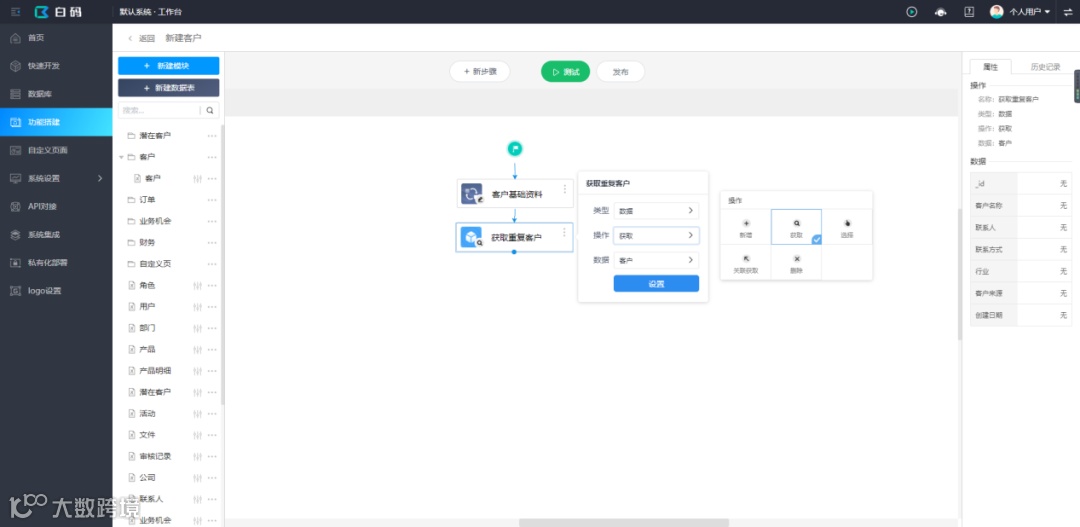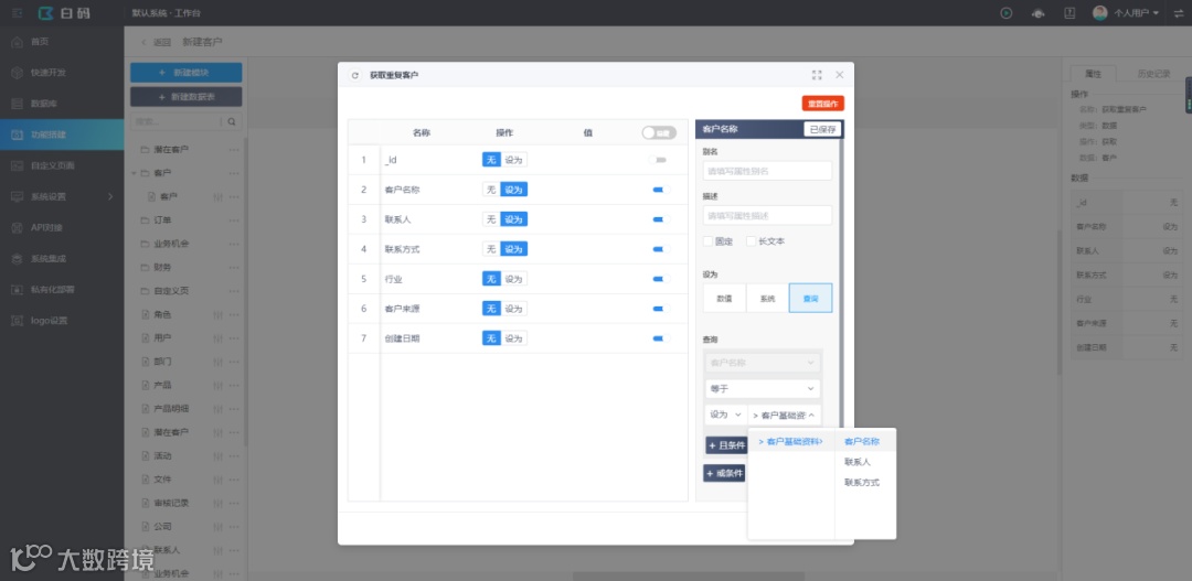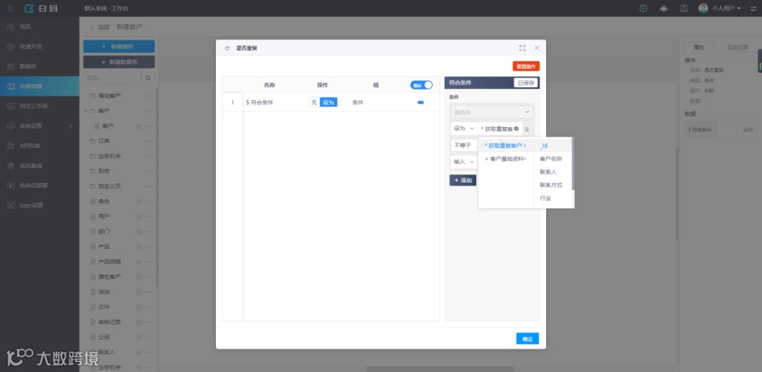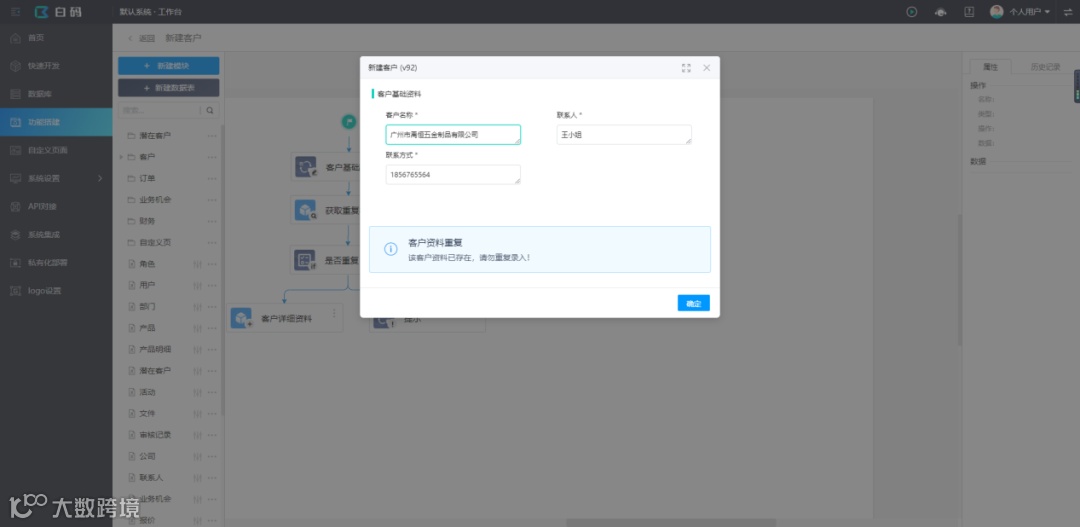 最近在做一个crm的项目,客户希望系统录入客户资料时可以去重,因为公司的几十个销售顾问原来都是用Excel记录客户资料的,难免会出现客户资料重复的情况,做起来非常麻烦,后来发现这个功能在白码无代码开发平台上做几分钟就能实现了,实现步骤如下:
