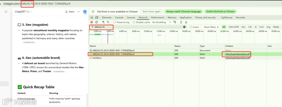 然后打开浏览器的控制后台,再NETWORK中过滤当前URL的第一段数字内容,找到后面这个JS文件,点击打开,在“REPONSE”中就能看到整个AI搜搜思考的过程了。