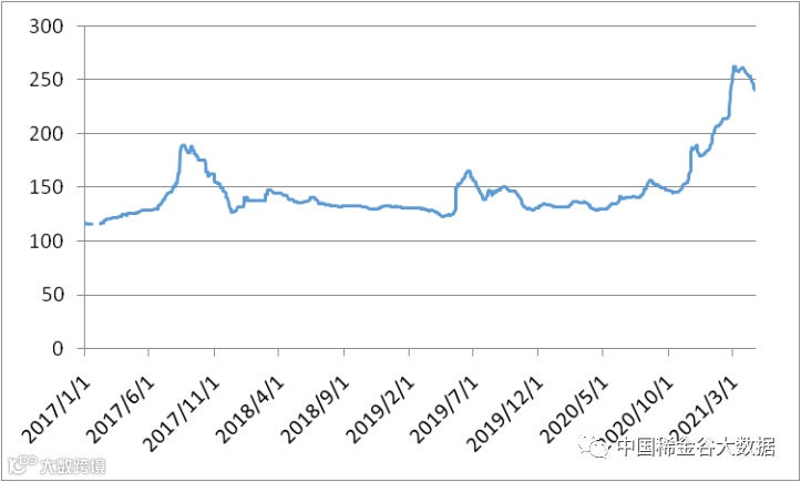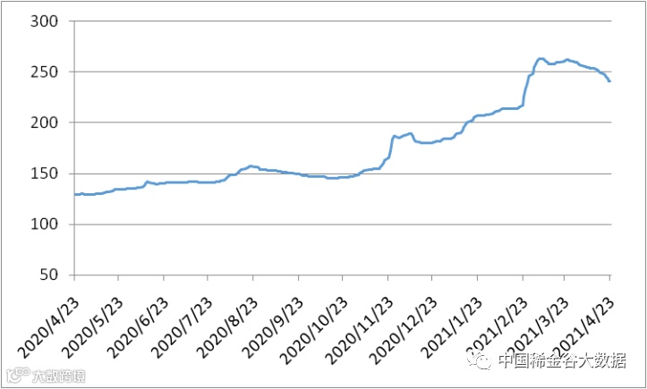 图1 镨钕系轻稀土挂牌价格走势图(202004-202104)