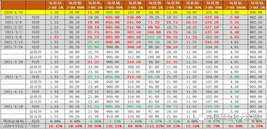 与2020年4月20日挂牌价同比分析,挂牌的11种氧化物均同比上涨。