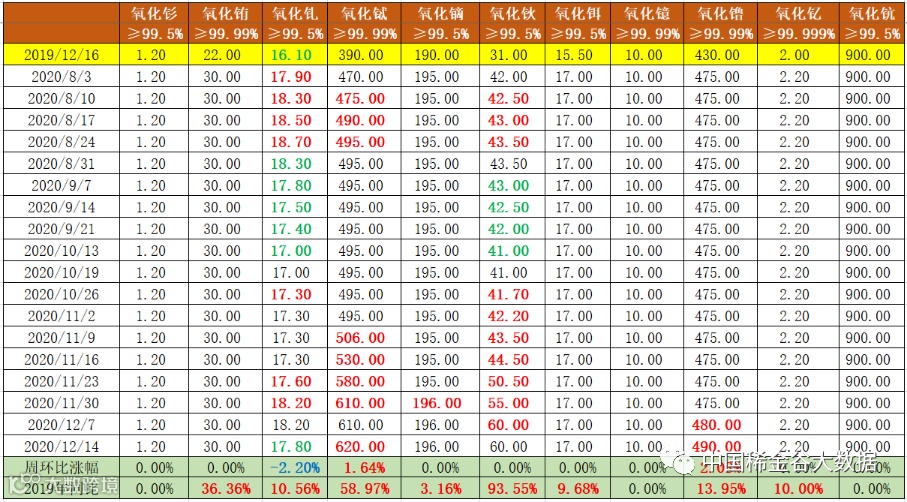 与今年11月份挂牌价格相比:镧、铈氧化物价格不变,镨、钕系金属及氧化物价格均上涨,氧化钕和金属钕调价幅度上涨超过30%。具体如下: