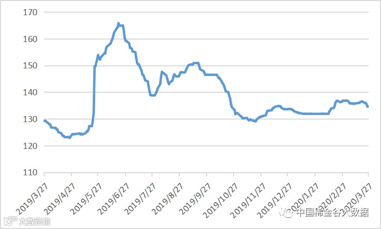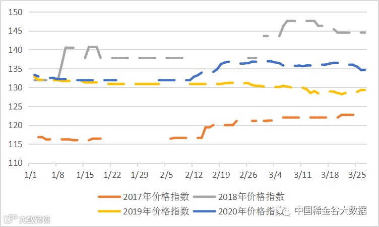 本周有五个交易日,稀土价格指数分别为136.0、135.9、135.5、134.6、134.5,本周价格指数走势轻微下调。稀土价格指数年度走势及近四年同期价格走势见20190327-20200327区间稀土价格指数走势图、2017-2020年稀土价格指数同期走势图。