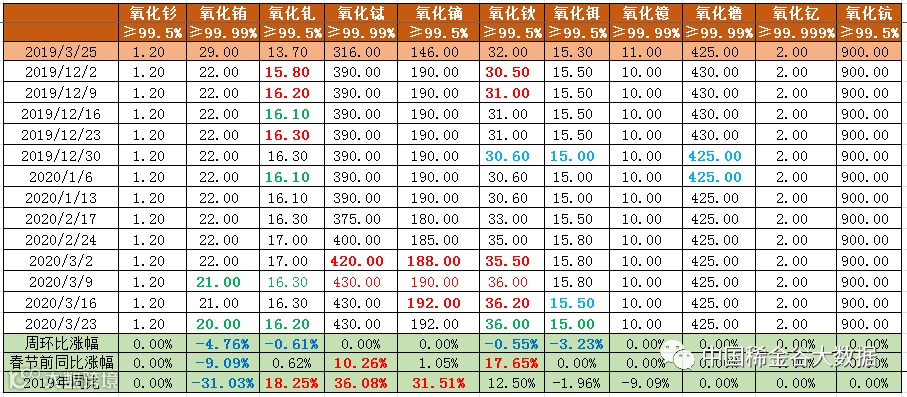 与2019年3月25日挂牌价同比分析:氧化钐、氧化钇、氧化镥、氧化钪同比价格不变;其它氧化物同比价格均有涨跌,其中同比价格涨幅超过15%的有氧化钆涨18.25%(涨幅较上次收窄)、氧化铽涨36.08%(涨幅较上次收窄)、氧化镝涨31.51%(涨幅较上次收窄),氧化铕价格同比下降,降幅为31.03%(跌幅较上次拉大)。