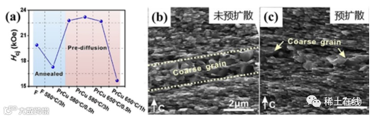 预扩散Pr-Cu低熔点相的方法能够解决传统晶界扩散时出现的Pr-Cu相在界面处偏聚严重的问题,使Pr-Cu在磁体内分布更加均匀,实现非磁性Pr-Cu相对Nd2Fe14B晶粒的包覆,从而有效减弱Nd2Fe14B晶粒间的磁耦合作用,提高磁体矫顽力(图2a);同时颗粒界面处均匀分布的Pr-Cu相能够更好地隔离晶粒,阻止晶粒间的融合生长,进而抑制界面处晶粒的过度长大和粗晶区的形成。相比未进行预扩散的磁体(图2b),界面粗大晶粒数量显著减少,粗晶区宽度也明显减小(图2c)。相关工作发表在Acta Materialia (2019, 174: 332-341)上。