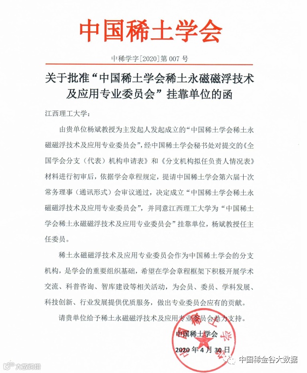 近日,中国稀土学会正式批复我校成立“中国稀土学会稀土永磁磁浮技术及应用专业委员会”。这是落实中国制造2025战略、推动我国稀土产业转型升级实现高质量发展的重要举措,将进一步消化稀土永磁及相关材料的过剩产能,为稀土永磁材料及其相关产业的精深发展提供广阔的市场空间,对稀土产业的高质量发展具有重要意义。