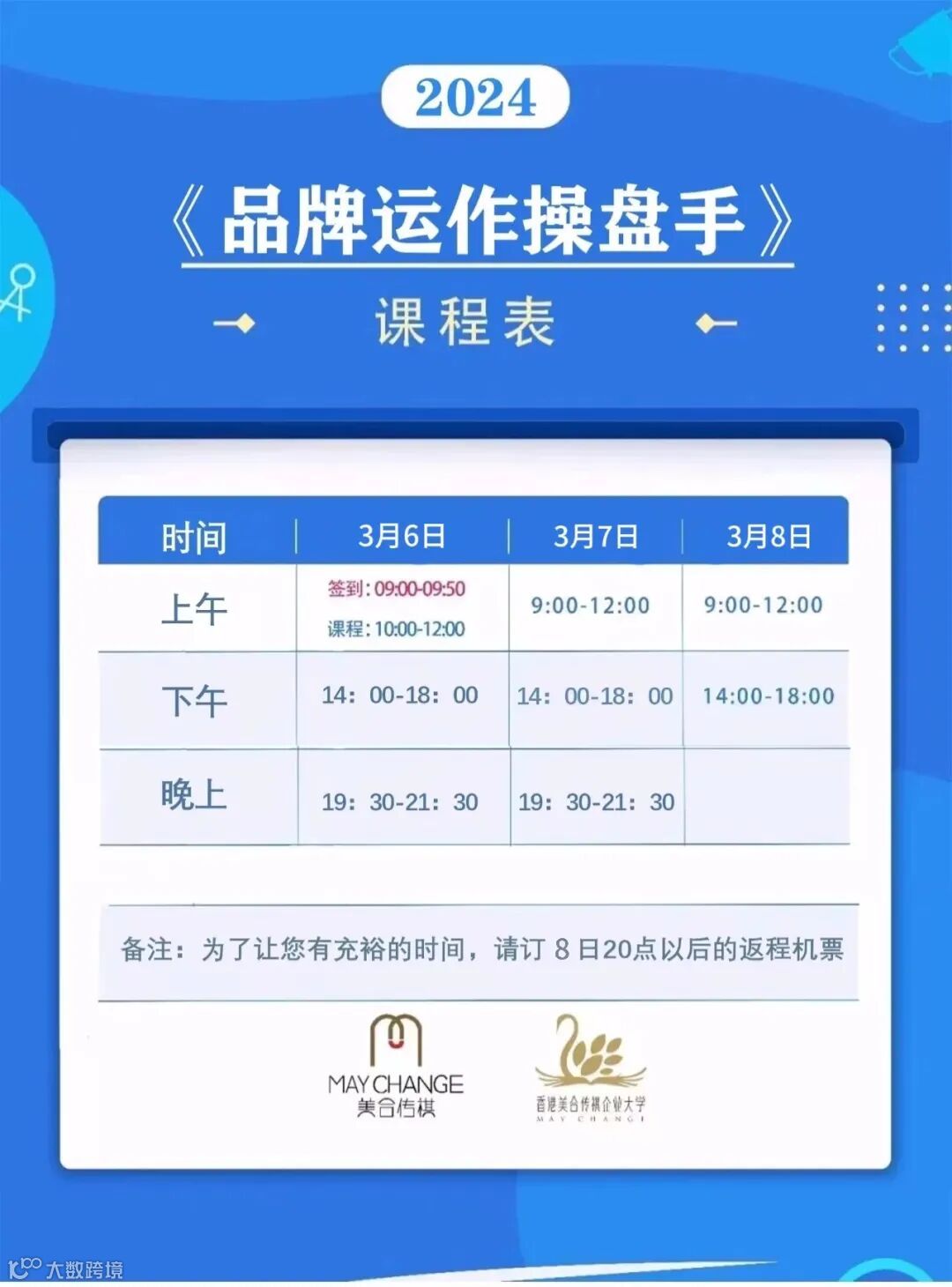 你们好!欢迎您参加美合传祺第47期《品牌运作操盘手》课程,美合传祺全体人员感谢您对本课程的关注和大力支持,并热烈欢迎您的到来。在2024年3月6-8日这3天2夜的时间里,我们将会与大家共同探讨、共同成长,透过学习,成为一名优秀的操盘手。为此,我们会务组也会以最高的服务品质让同学们轻松、快乐的享受学习旅程。美合传祺全体人员祝您学习愉快!