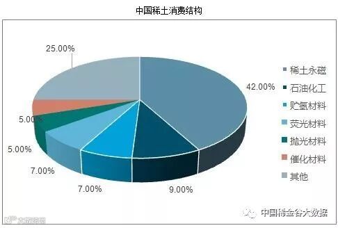 目前中国既是全球最大的稀土生产国,同时又是全球最大的稀土出口国和消费国,占到了全球稀土消费总量的56.5%。其中,中国稀土消费领域中最多的是永磁材料、之后是石油化工领域以及一些材料领域(贮氢、荧光、抛光、催化材料等)。