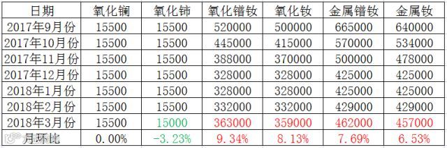 包钢稀土国贸公司于3月8日发布3月份轻稀土挂牌价格(表二),氧化镧价格持平,氧化铈轻微下调。镨钕系列均有不同程度上涨,氧化镨钕、氧化钕上涨幅度分别为9.34%、8.13%,市场预期较好。