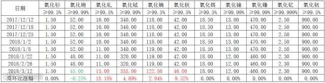 表一 中重稀土氧化物2017年12月-2018年3月挂牌价格 万元/吨