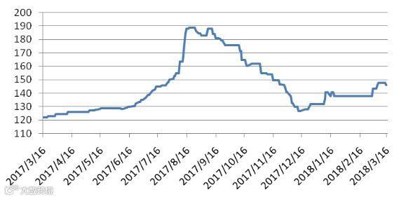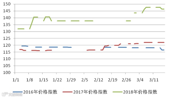 本周五天稀土价格指数分别为147.6、147.6、147.6、146.3、146.3,本周价格指数同上周相比,前三天持平,后两天轻微下跌。稀土价格指数近一年走势见20170316-20180316区间稀土价格指数走势图。对比2016及2017年同期,价格指数同比上涨,对比图见2016-2018年稀土价格指数同期走势图。