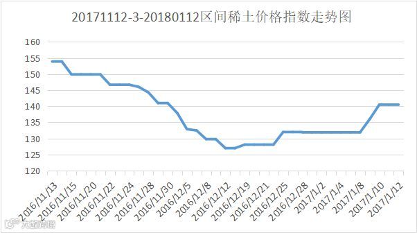 本周五天稀土价格指数分别为131.9、136.0、140.5、140.5、140.5,价格指数呈回升态势。本周前三天由上周131.9上升至140.5,后两天持平。从近两个月20171112至20180112区间来看,稀土指数于2017年12月12日达到最低点,逐步出现缓慢回升态势,稀土市场温和回升。