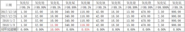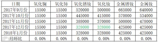 1月9日内蒙古包钢稀土国际贸易有限公司发布2018年1月轻稀土氧化物指导价格,与2018年12月份相比,各产品价格持平,未发生变化。