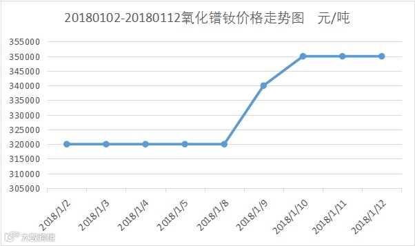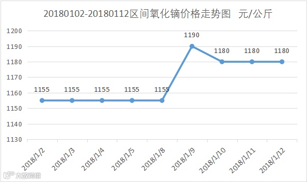 1月8日南方稀土集团发布本周中重稀土挂牌价格,与上周相比,本周氧化钆与氧化镝上涨,其它氧化物价格持平。这是自2017年11月27日大面积下调报价后,首次对中重稀土氧化物价格进行调整。氧化钆由上周10万元/吨上调至11万元/吨,涨幅10%,氧化镝由上周118万元/吨上调至119万元/吨,涨幅0.85%。