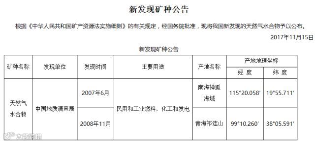 11月16日,国土资源部在北京召开新闻发布会,宣布天然气水合物新矿种获得国务院批准,公告号2017年第36号,天然气水合物成为我国第173个矿种。(摘自:国土资源部)