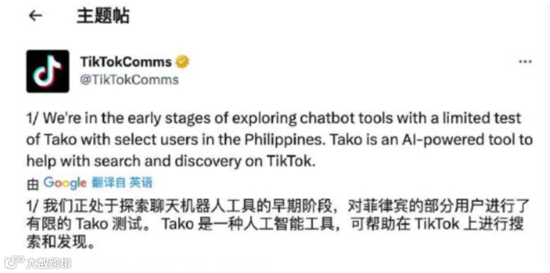 字节跳动旗下短视频社交平台TikTok宣布,正在菲律宾面向部分用户测试一款名为Tako的人工智能(AI)聊天机器人。该聊天机器人由第三方聊天助手提供支持,可以帮助用户在TikTok进行互动交流并发现感兴趣的短视频内容。