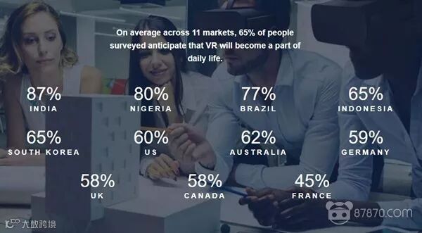 本次调研涉及11个国家共11300人,65%的受访者认为VR将成为人们日常生活的一部分。人们对AR和VR的兴趣只会增长,因为他们将越来越多地在现实、增强和虚拟世界之间移动。通过利用这些新兴技术,品牌可以创造体验让人们拥有身临其境的感觉,即使他们不能在那里。