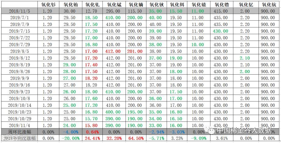 与上次发布(10月29日)相比,氧化钆本周挂牌价上涨;氧化铕、氧化钬、氧化铒本周挂牌价下跌;其它氧化物价格不变。