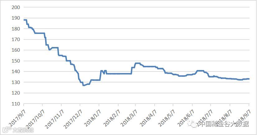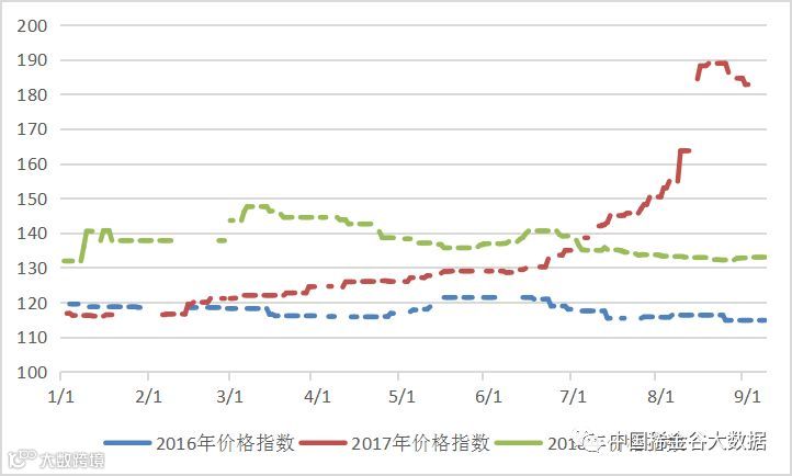 本周有五个交易日,稀土指数均为133.0,本周稀土指数与上周相比有小幅上涨,近一年走势见20170907-20180907区间稀土价格指数走势图。对比2016及2017年同期,2017年价格指数呈快速上涨趋势,达到188.9点,后开始出现下降。见图2016-2018年稀土价格指数同期走势图。