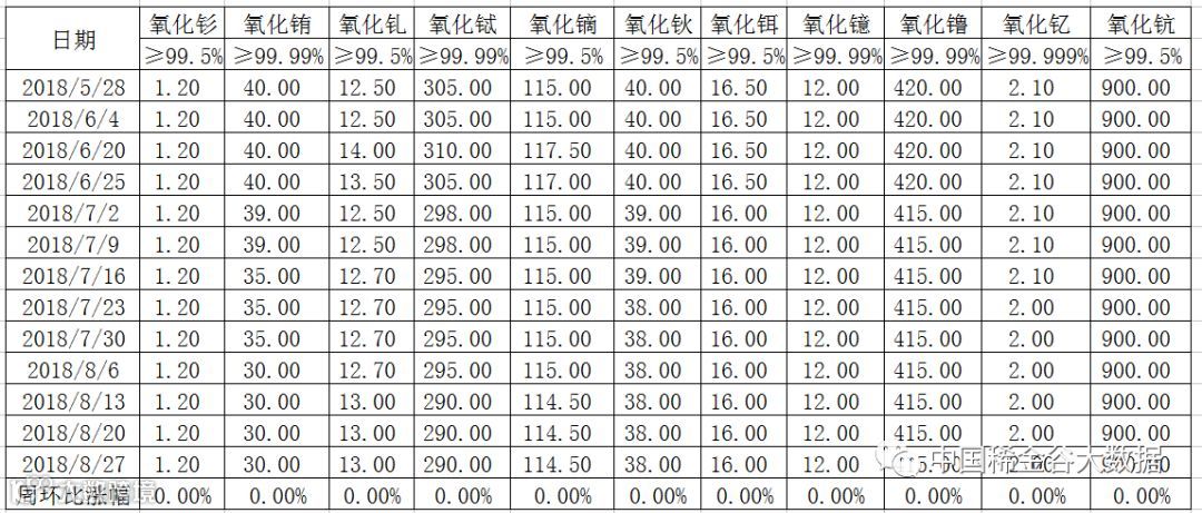 表一 中重稀土氧化物2018年5-8月挂牌价格 万元/吨