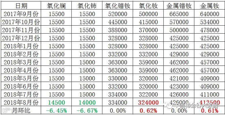表二 轻稀土系列2017年9月-2018年8月份挂牌价格 元/吨