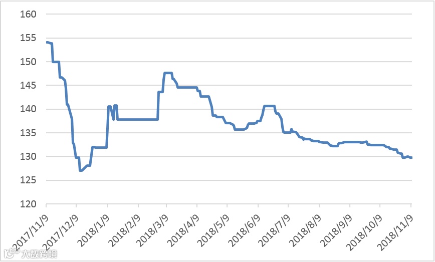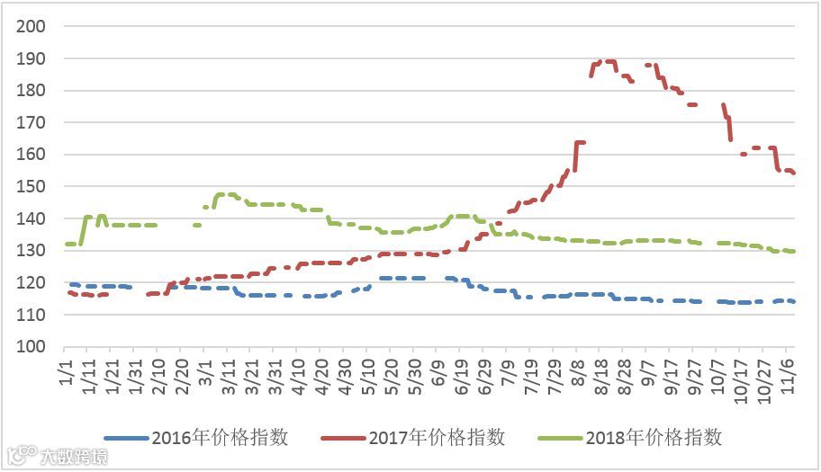 本周有五个交易日,稀土价格指数分别为130、130、129.9、129.8、129.8,与上周上比,本周价格指数趋稳,轻微小幅振荡。近一年走势见20171109-20181109区间稀土价格指数走势图。对比2016及2017年同期,2017年价格指数呈快速上涨趋势,达到188.9点,后开始出现下降。见图2016-2018年稀土价格指数同期走势图。