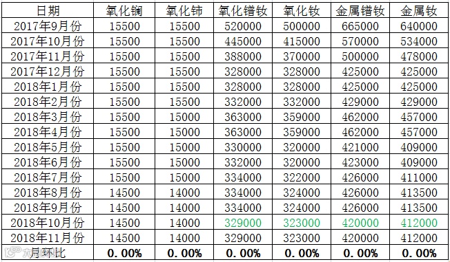 北方稀土市场营销部于11月9日发布11月份轻稀土挂牌价格(表二),与上月相比报价报价均持平,未发生变化。