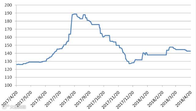 本周五个交易日稀土指数均为142.6,与上周相比没有发生变化。稀土价格指数近一年走势见20170413-20180413区间稀土价格指数走势图。对比2016及2017年同期,价格指数同比上涨,见图2016-2018年稀土价格指数同期走势图。