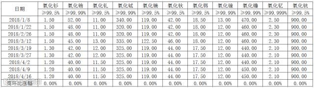 表一 中重稀土氧化物2018年1-4月挂牌价格 万元/吨