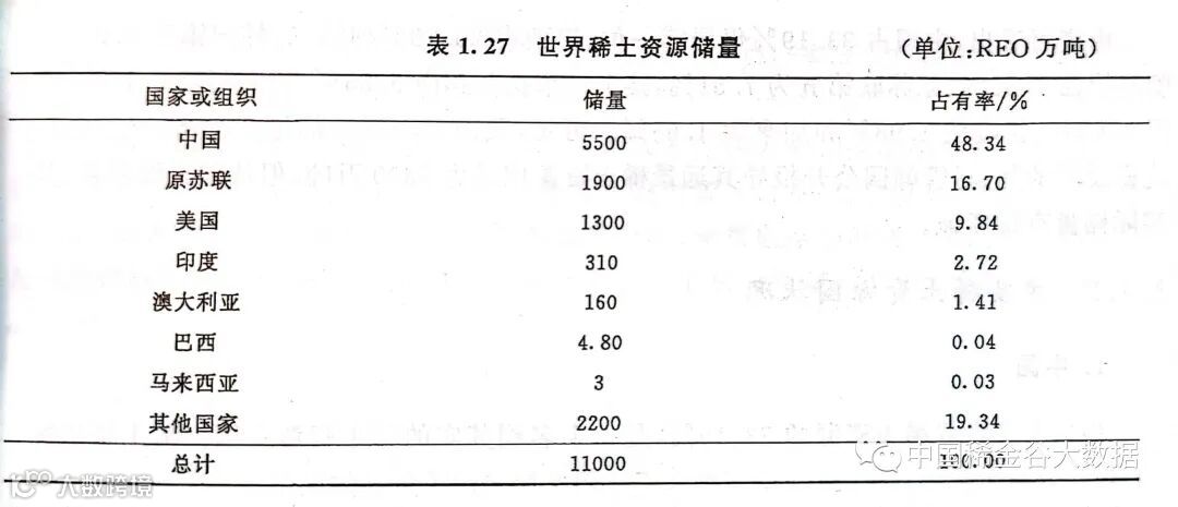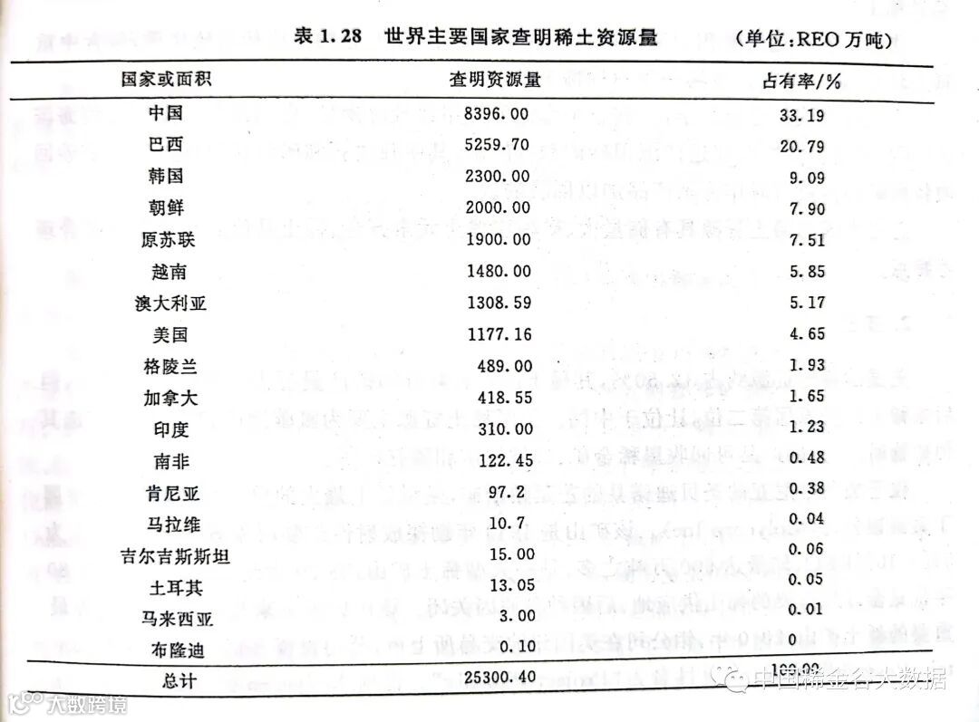 根据这份美国地质调查局2011年的报告,中国、原苏联和美国的稀土资源量占全球总量的74.88%。但是美国地质调查局的此项报告仍有值得商榷的地方。报告中统计中国稀土储量占48.34%,但2012年的《中国稀土白皮书》公布中国稀土储量的比例为23%;同时巴西的稀土资源量没有更新,巴西实际稀土储量约为5260万吨。下表中也没有考虑越南、朝鲜、缅甸等国的稀土资源。