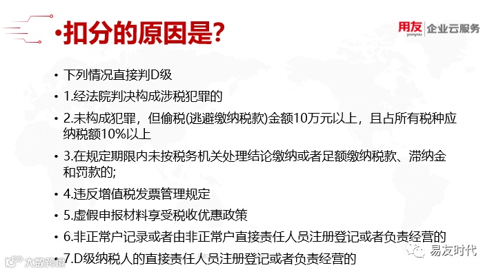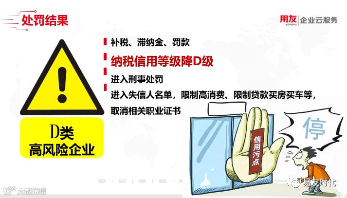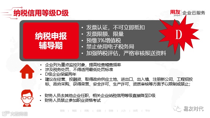 纳税信用等级降至D级后,企业进入纳税申报辅导期,第一你取得的增值税专用发票认证不能再网上认证,只能到税务局窗口认证,对方开给你的发票不能立即进行抵扣,需等交叉稽核比对完成后方可抵扣(稽查稽核比对时间一把在3—6个月),占用企业的资金量。同时你自己的专票限制额度、购买量。发票额度限制在万元版以下,发票购买量每次最多25份,第三下个月领发票时按上次申领发票额度的3%预缴增值税,影响业务正常开展,占用流动资金,比如:企业一笔业务营业额为30万,企业最多能开出25万的金额,发票不够需要再去申领发票,申领发票同时需预缴(25万*3%)7500元税款。