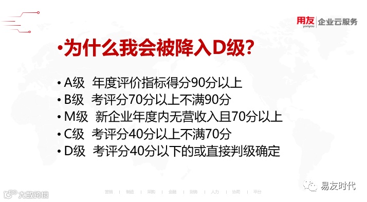 D类判级决定条件,第二点偷税金额10万且占应纳税额10%以上,10万的认定是税务局进行认定,不管你是主观还是非主观。第六点第七点可以关联起来理解,我们在做的集团性公司或者有分支机构,控股单位的一定要注意,尤其是下属公司在外地的那种情况,因为你不能有效的把控他的风险,一旦他降级了,你集团总部就会受到影响。(而且还会连累我们的领导)未来趋势A类企业和D类企业会越来越多。