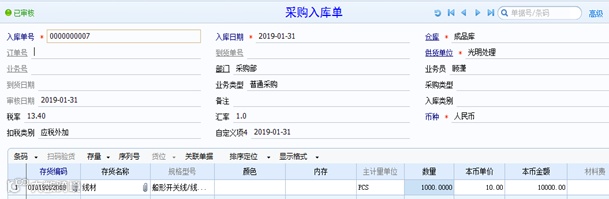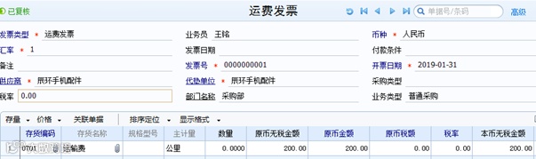 2、 入库单和发票做费用折扣结算,必须做结算成本处理(入库单需是记账状态),生成入库调整单。入库单价格不会回写运费发票金额,在明细账中也是以调整单的形式体现。