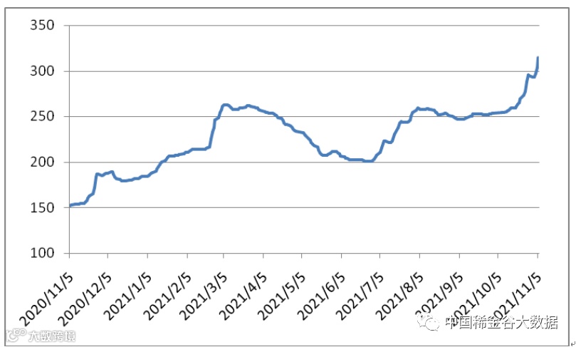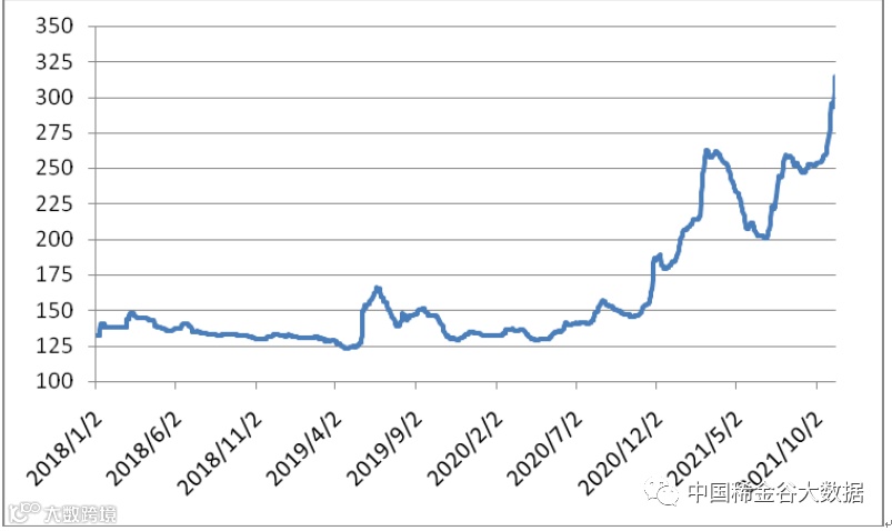 本周有5个交易日,稀土价格指数分别为293.1、293.5、297.1、304.3、314.5,价格指数本周上涨较快,20201105-20211105区间稀土价格指数走势图、2018-2021年稀土价格指数同期走势图。
