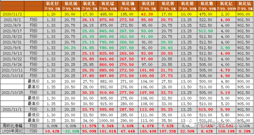 与2020年11月2日挂牌价同比分析,氧化铕同比下降(降幅32.5%→32.5%,降幅与上期相比,不变),其它10种氧化物均同比上涨。