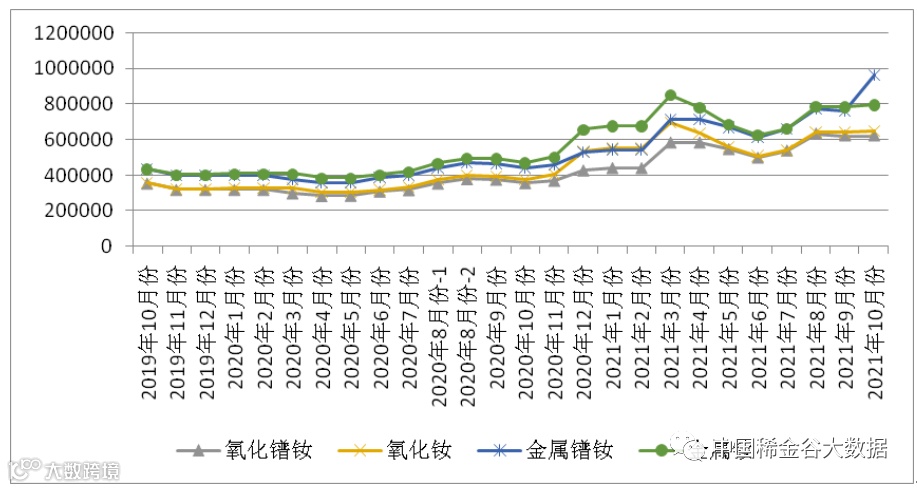 图1 镨钕系轻稀土挂牌价格走势图(201910-202110)