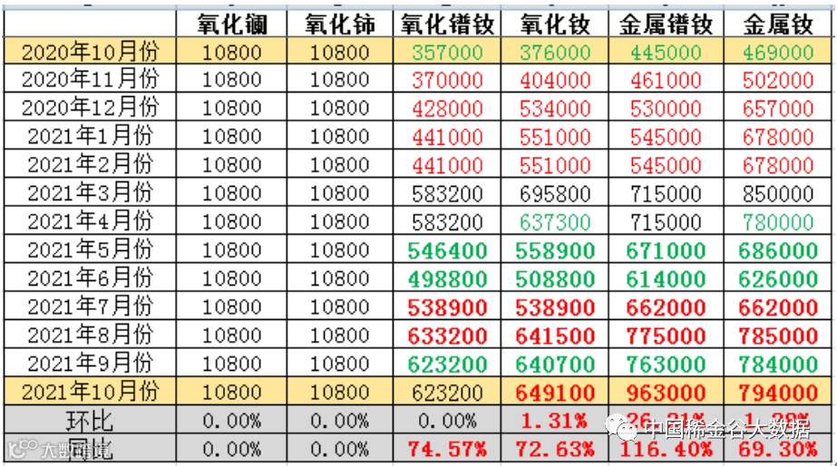 与9月份挂牌价格相比,镧、铈氧化物价格不变,氧化钕及镨钕系金属价格环比上升,金属镨钕价格环比涨幅超过20%。