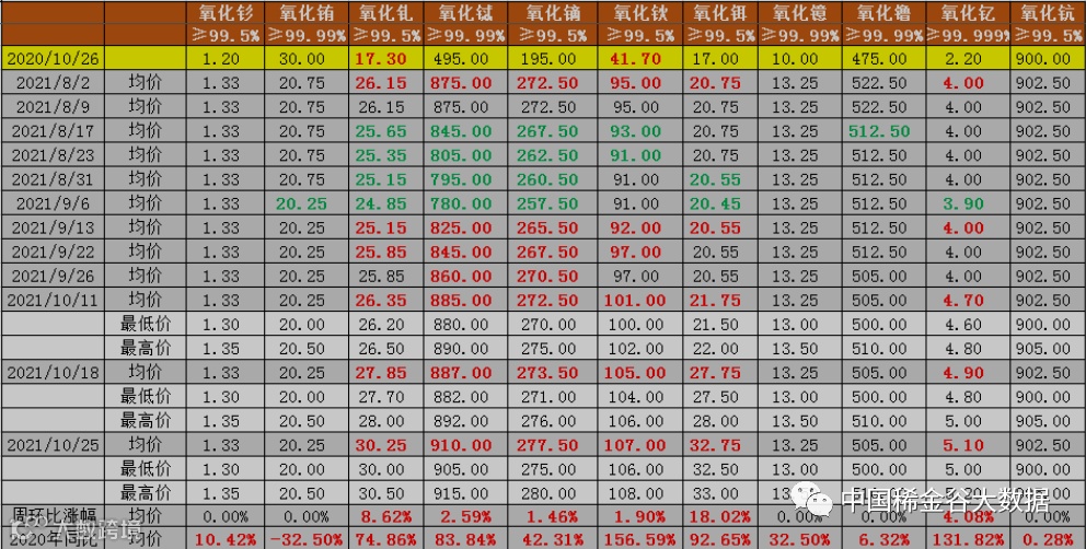 与2020年10月26日挂牌价同比分析,氧化铕同比下降(降幅32.5%→32.5%,降幅与上期相比,不变),其它10种氧化物均同比上涨。