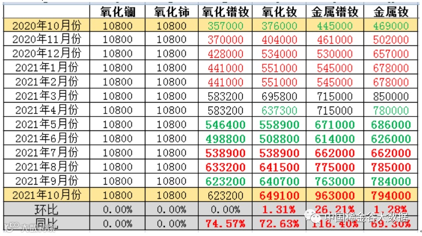 与9月份挂牌价格相比,镧、铈氧化物价格不变,氧化钕及镨钕系金属价格环比上升,金属镨钕价格环比涨幅超过20%。